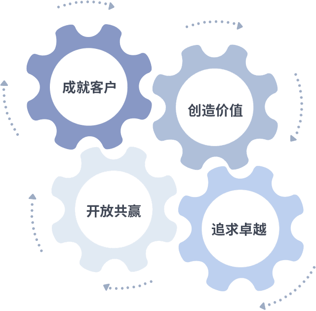 成就客户是一切决策的出发点,,创造价值是衡量所有工作的标准,,,,追求卓越是我们做事做人的态度,,,开放共赢是我们的格局也是最终的结果。。。。价值观的齿轮环环相扣,,推动着组织里的每个人不断向前。。。