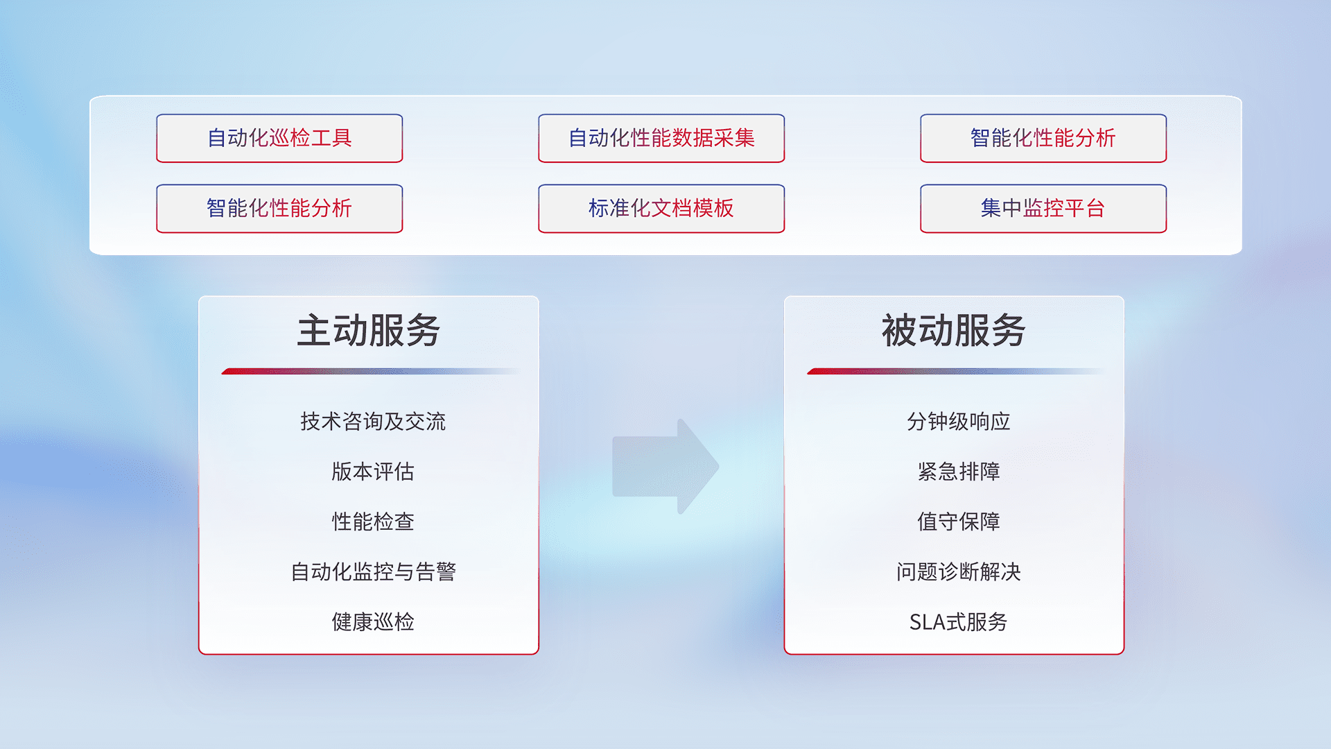 智能化工具和标准化文档,,,保障服务质量,,提供主动服务(包含技术咨询、、、、版本评估、、、性能检查、、自动化监控与告警、、、健康巡检)和被动服务包含(分钟级响应、、、、紧急排障、、值守保障、、问题诊断解决、、SLA服务)。。